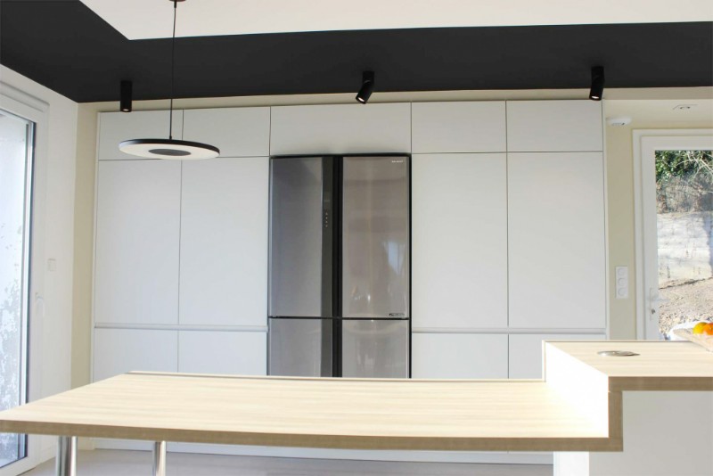 Nous avons opté pour un modèle de cuisine sans poignée, pour respecter parfaitement les lignes, nous avons faits réaliser des meubles sur-mesure.