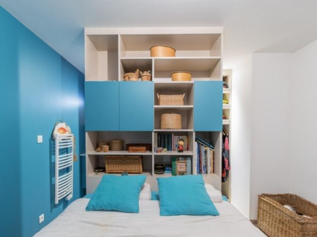 - La tête de lit fut pensée toute hauteur avec des rangements en façade et des tiroirs sur les côtés.